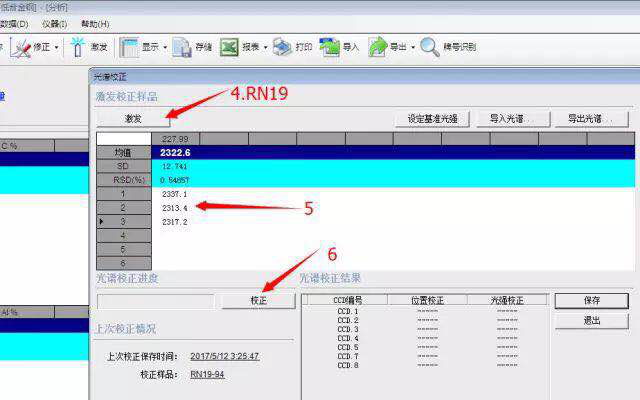 2.在激發臺放上RN19校正樣品后單擊"激發",打五組數據(選擇三組較好的)